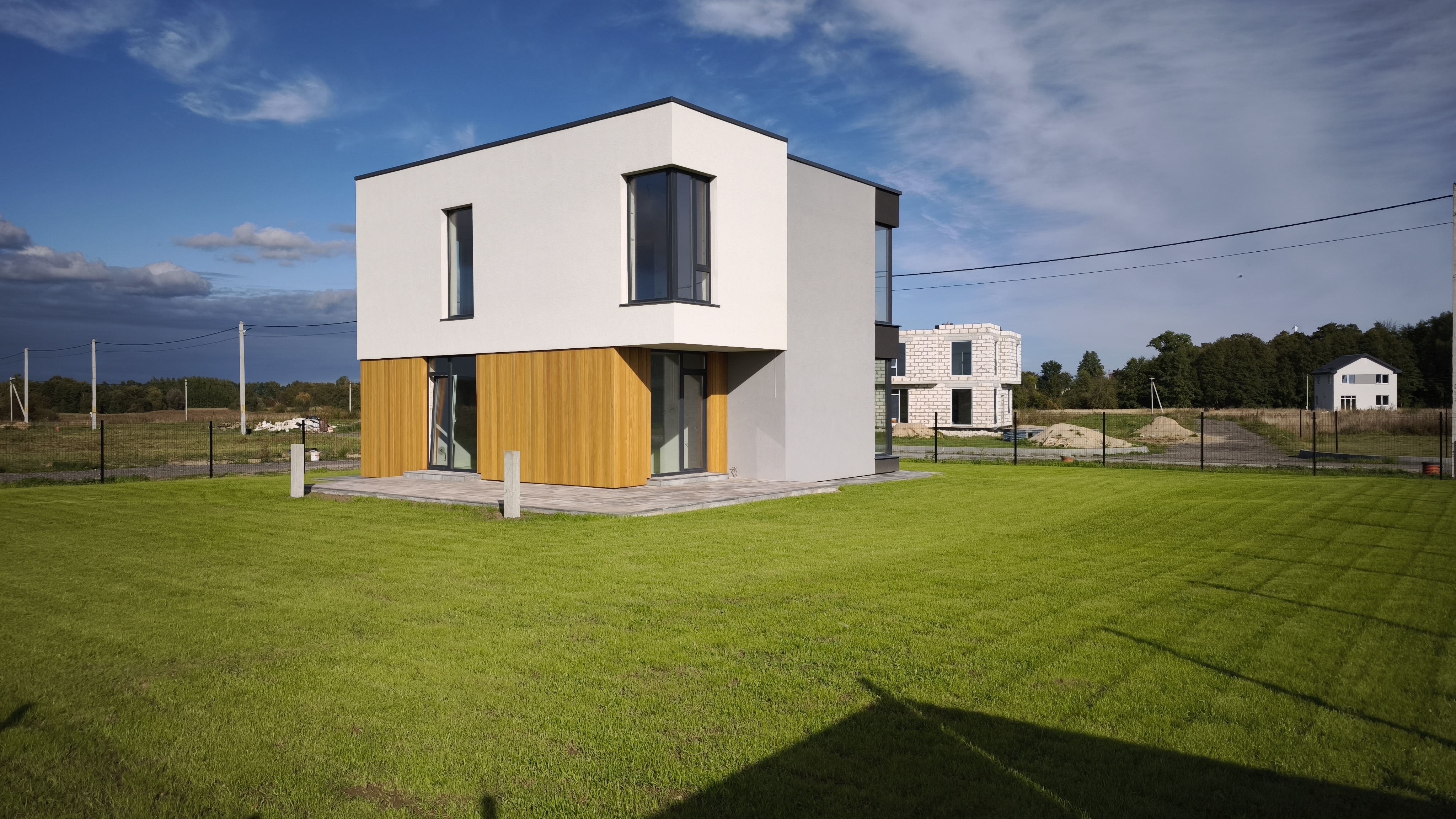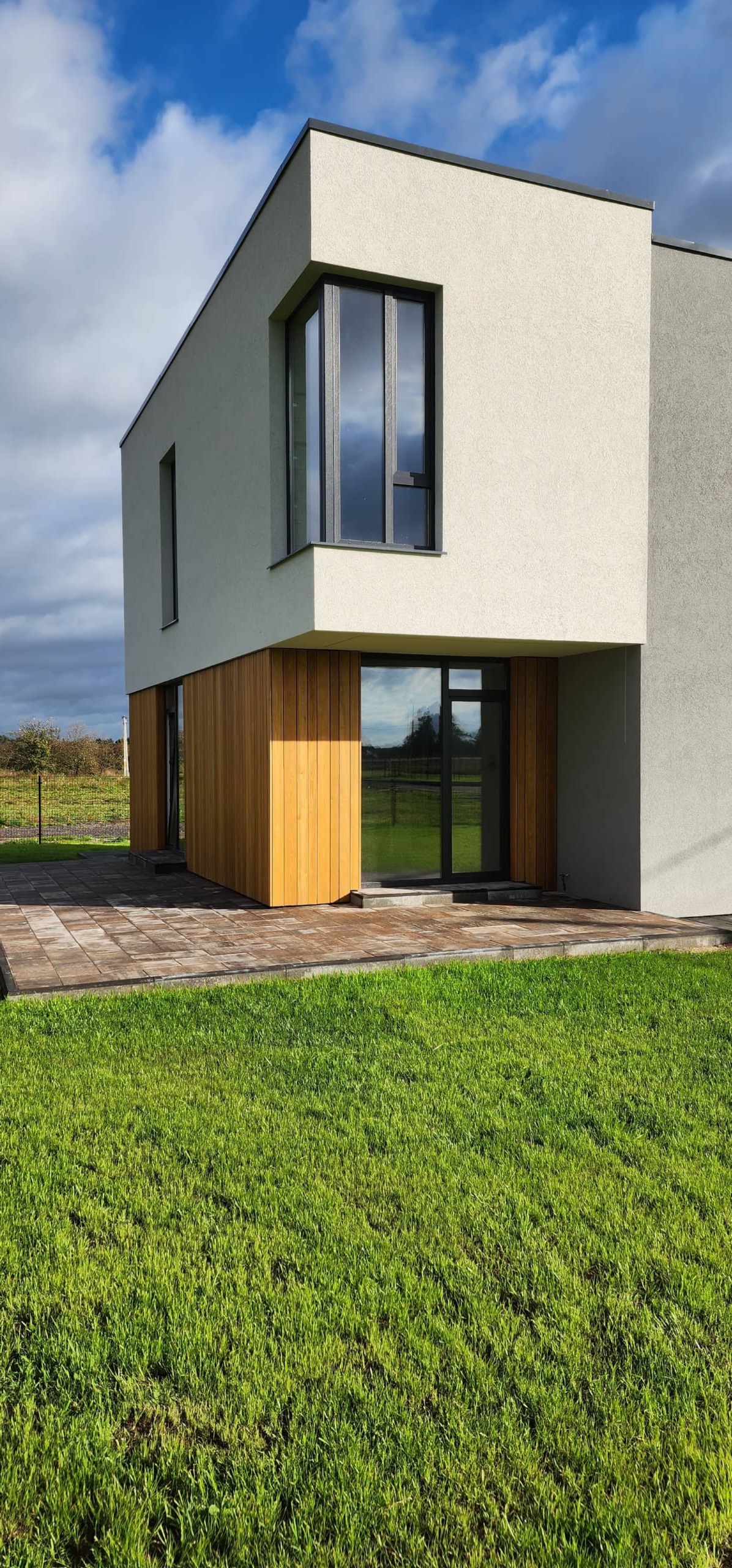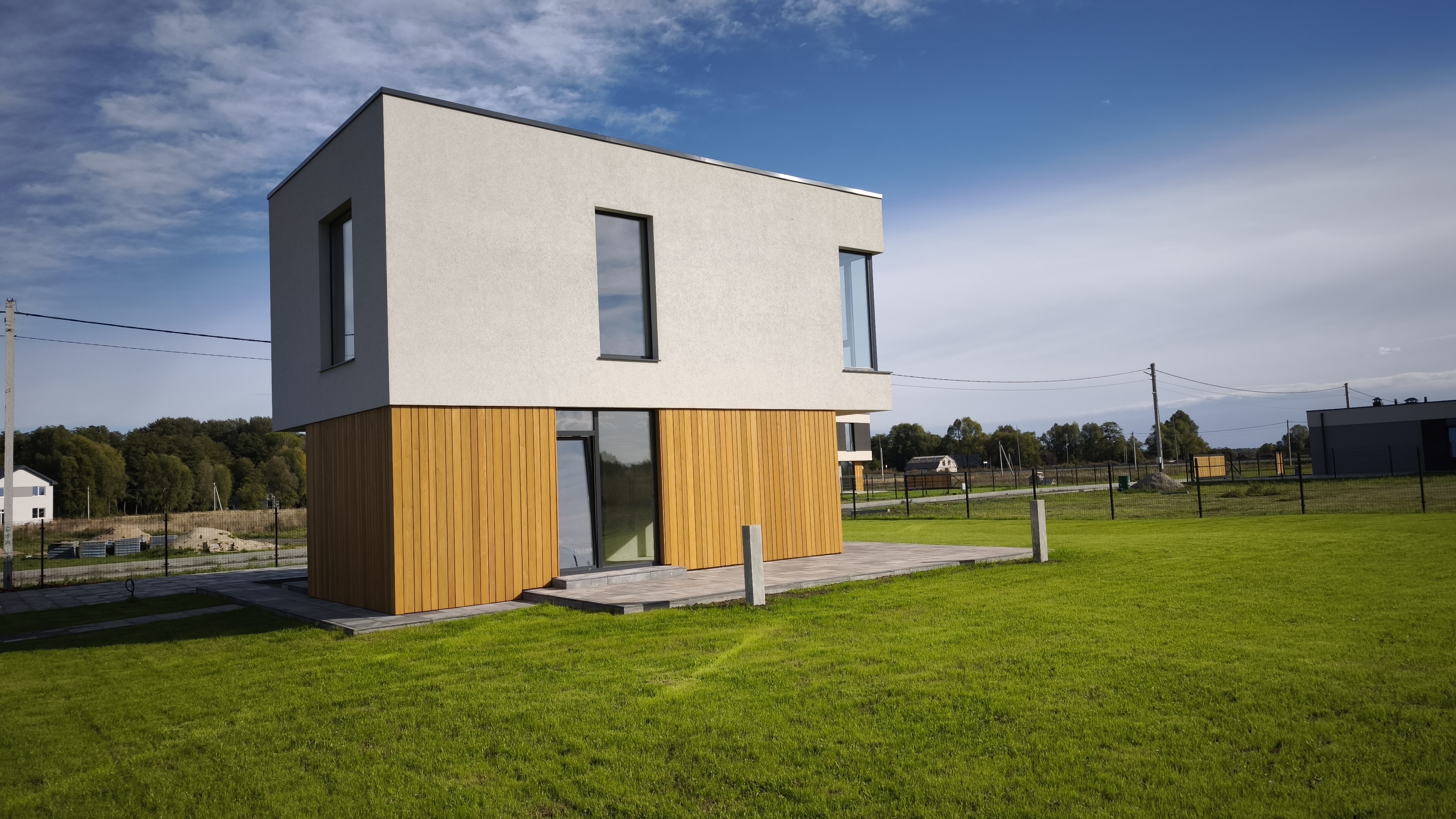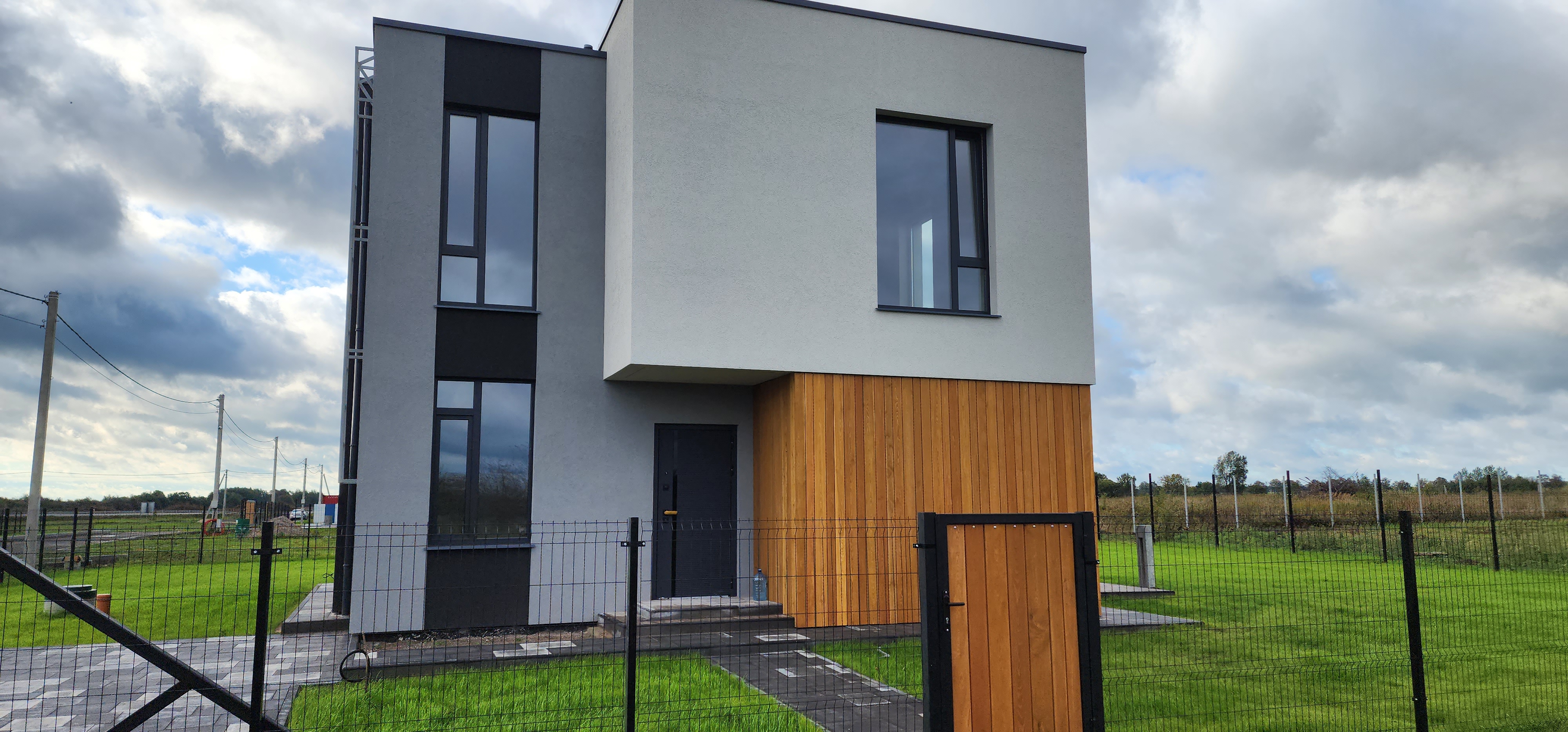 Современный загородный дом с объединённой кухней и гостиной, наполненный светом благодаря большим окнам. Идеальное пространство для комфортной жизни всей семьи и приёма гостей.