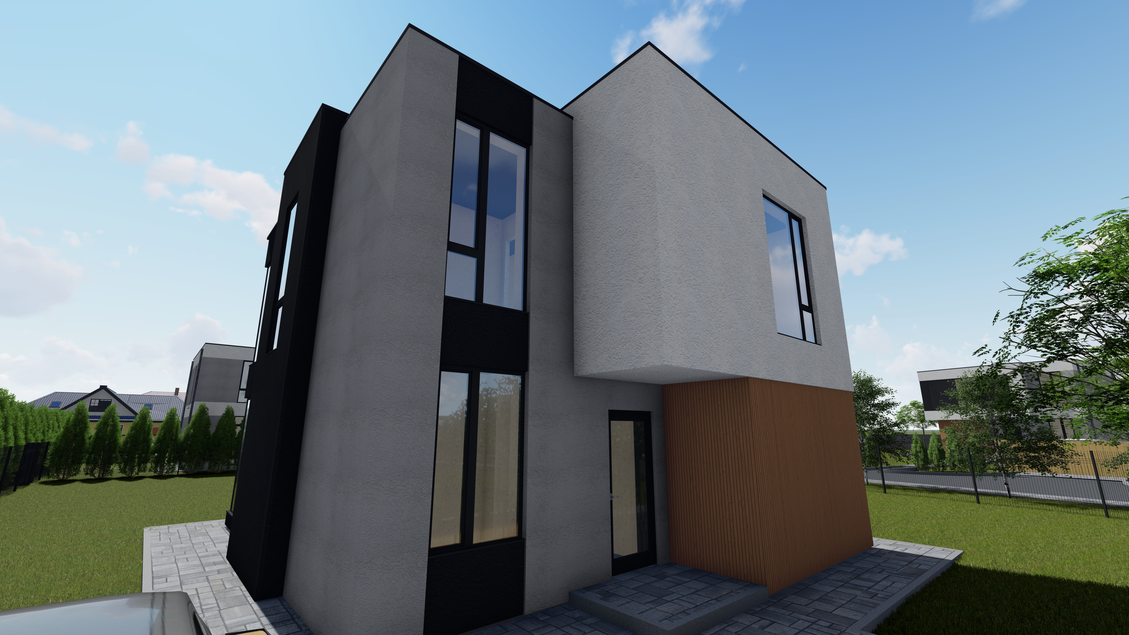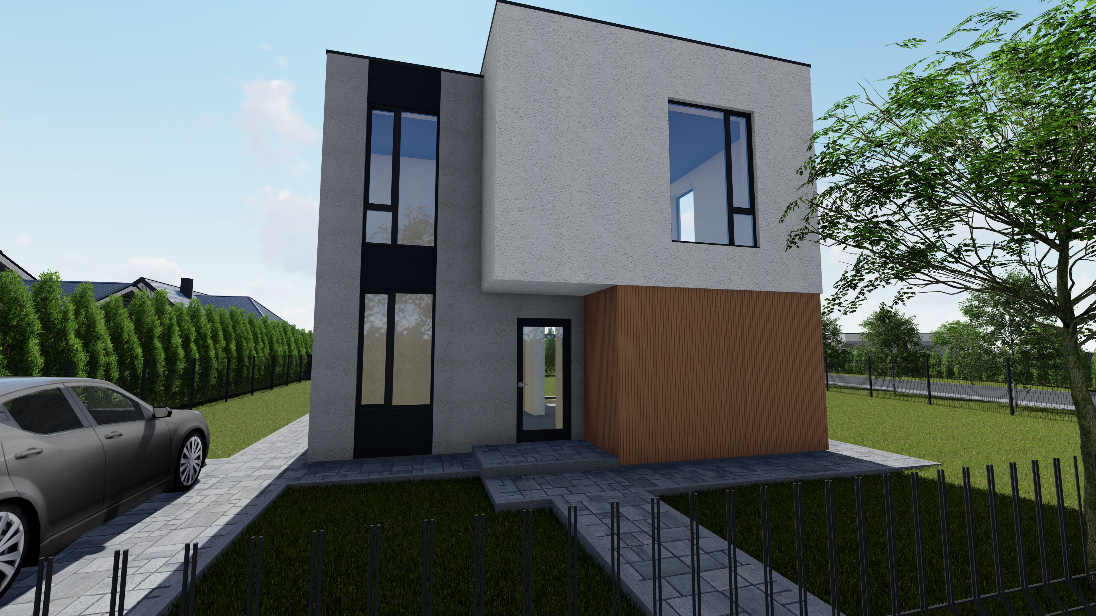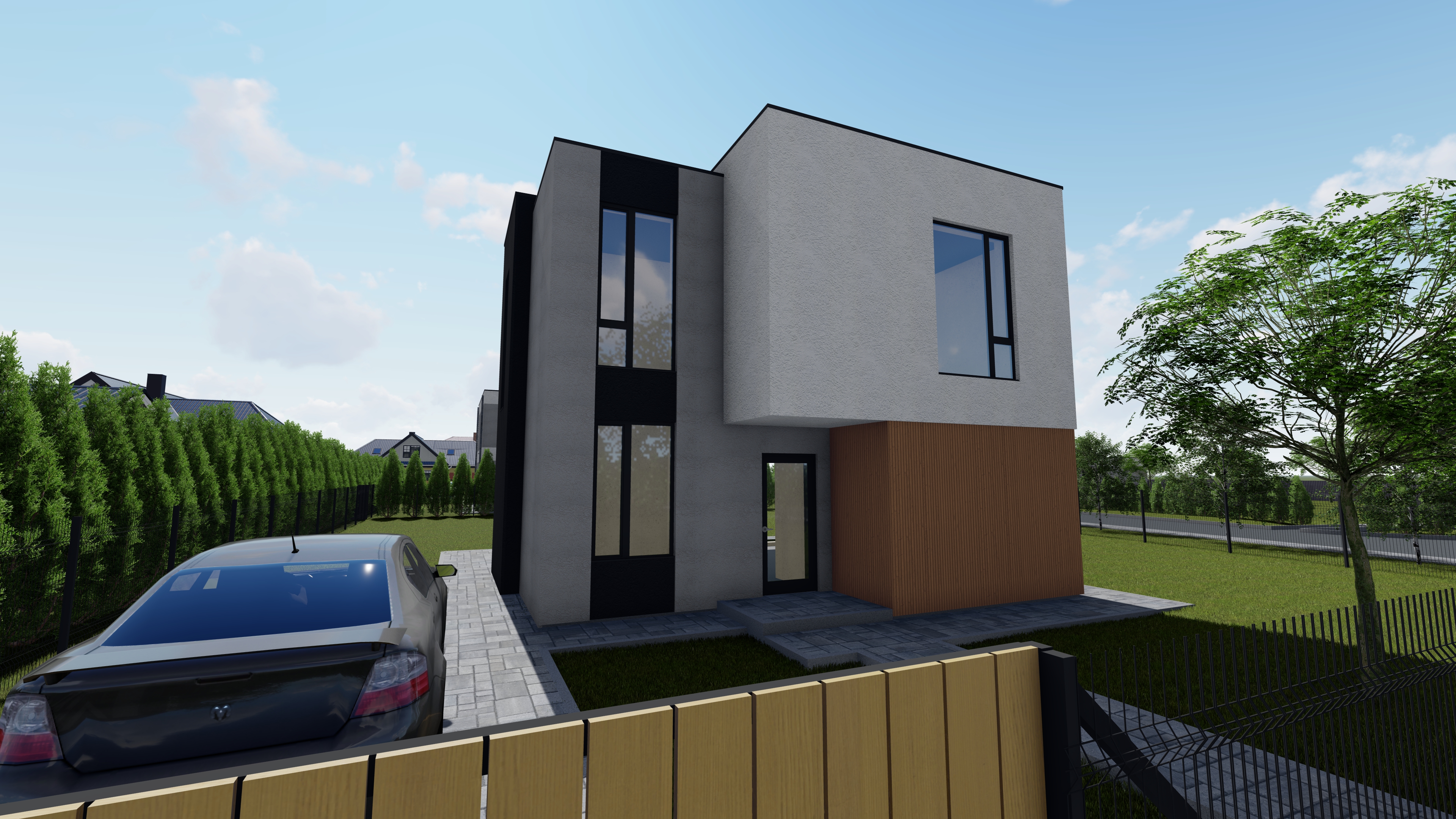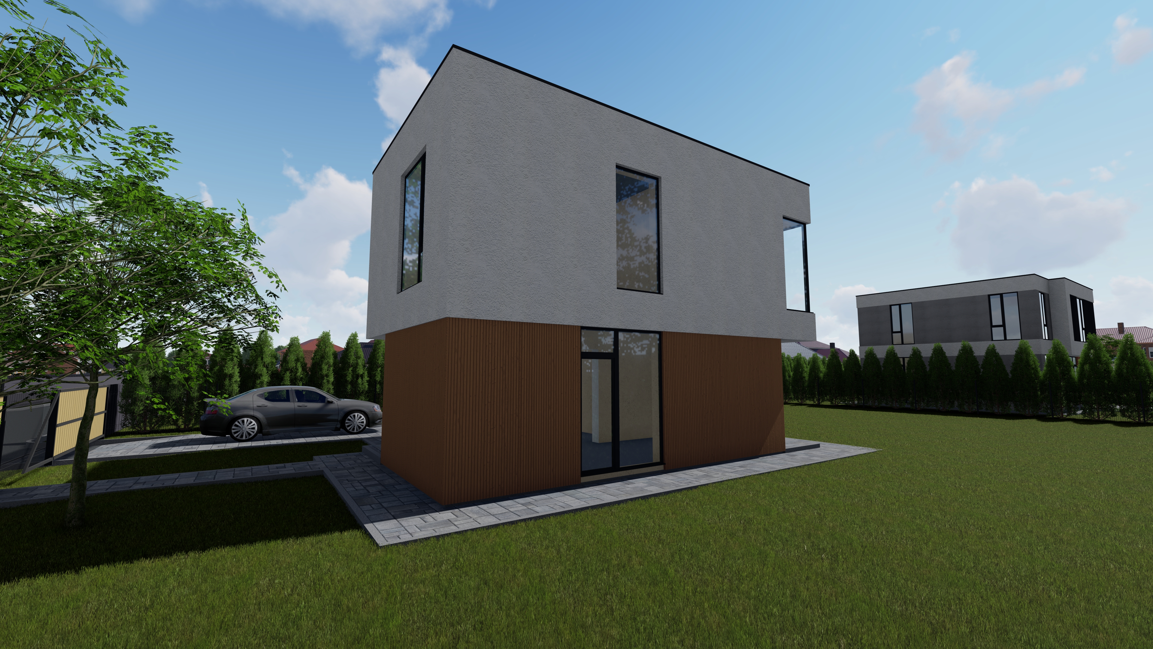 Современный загородный дом с объединённой кухней и гостиной, наполненный светом благодаря большим окнам. Идеальное пространство для комфортной жизни всей семьи и приёма гостей.
