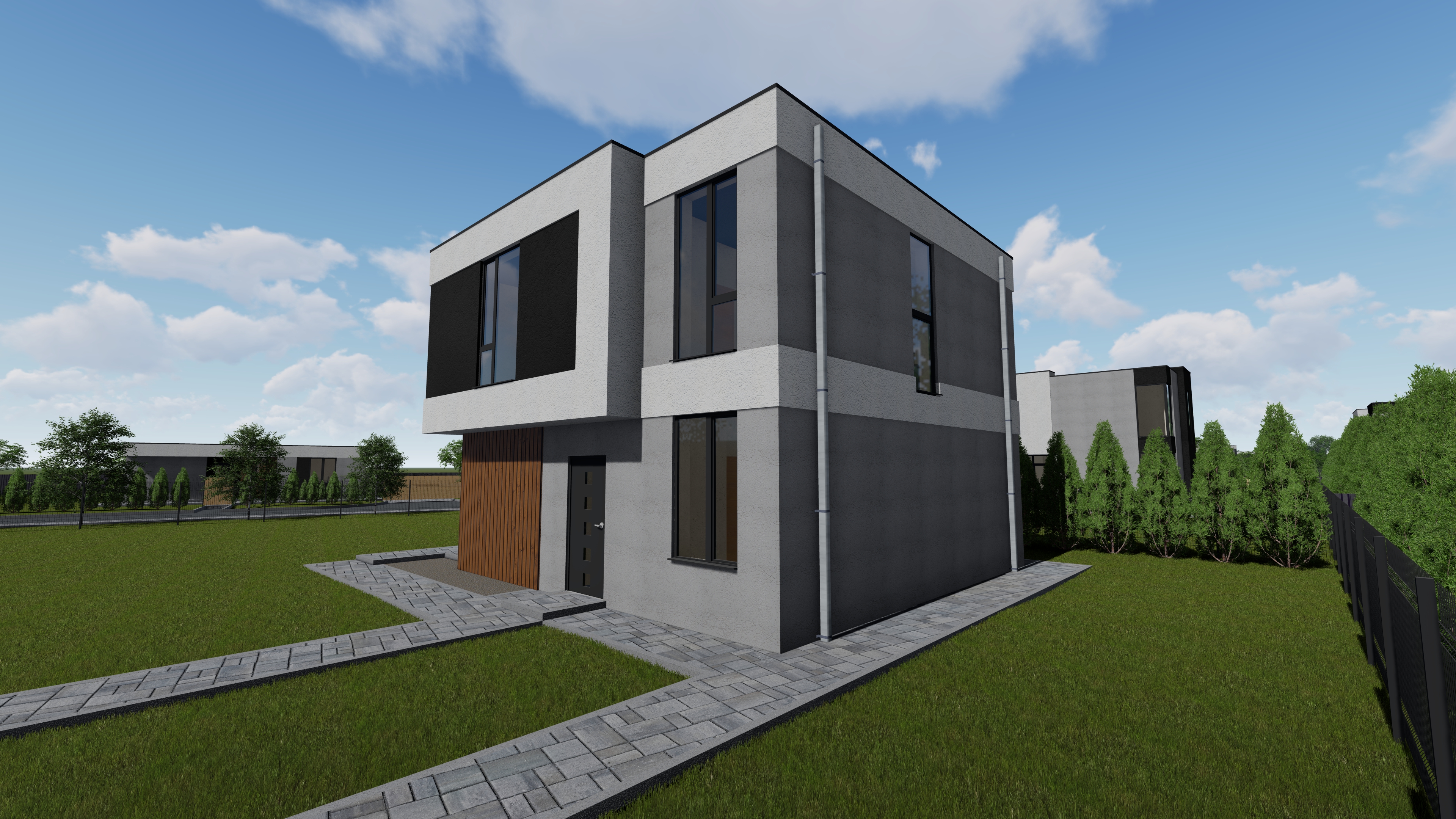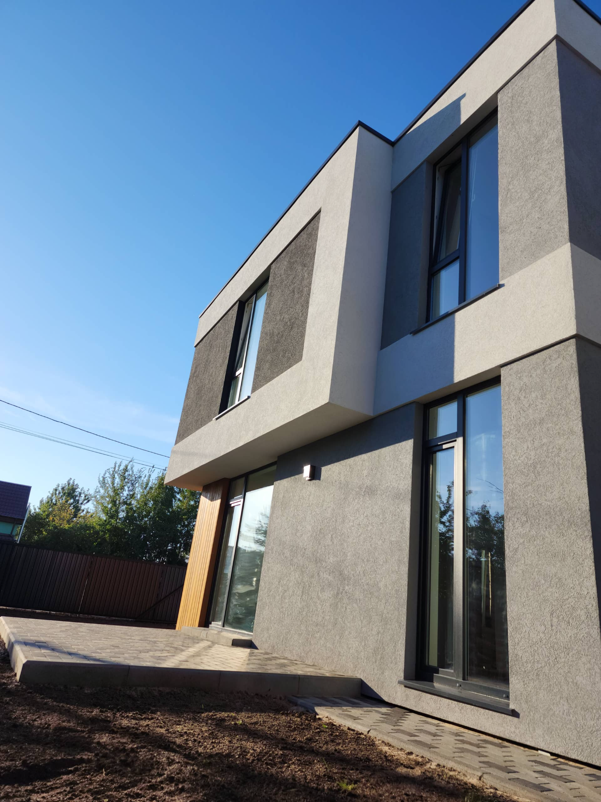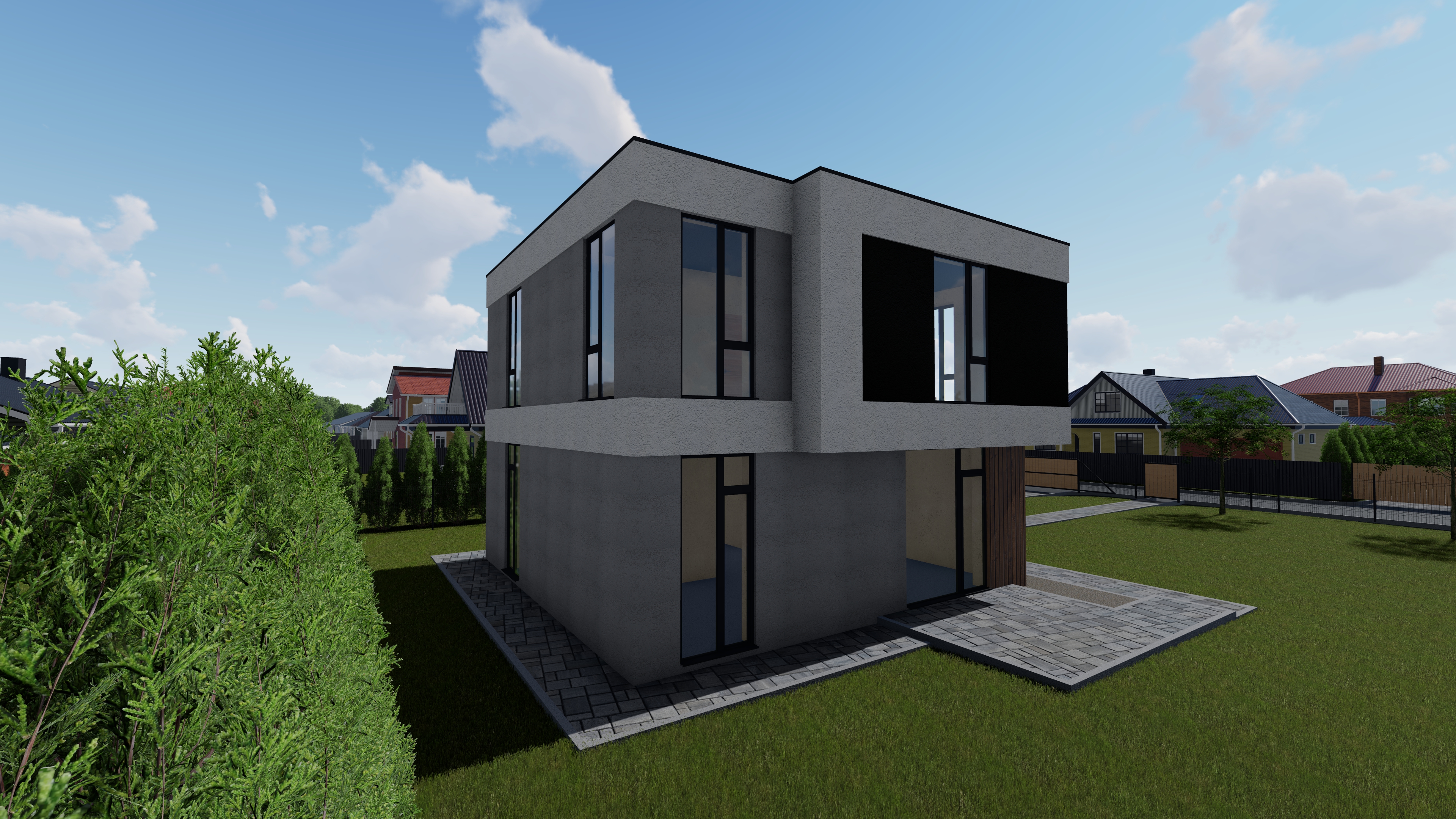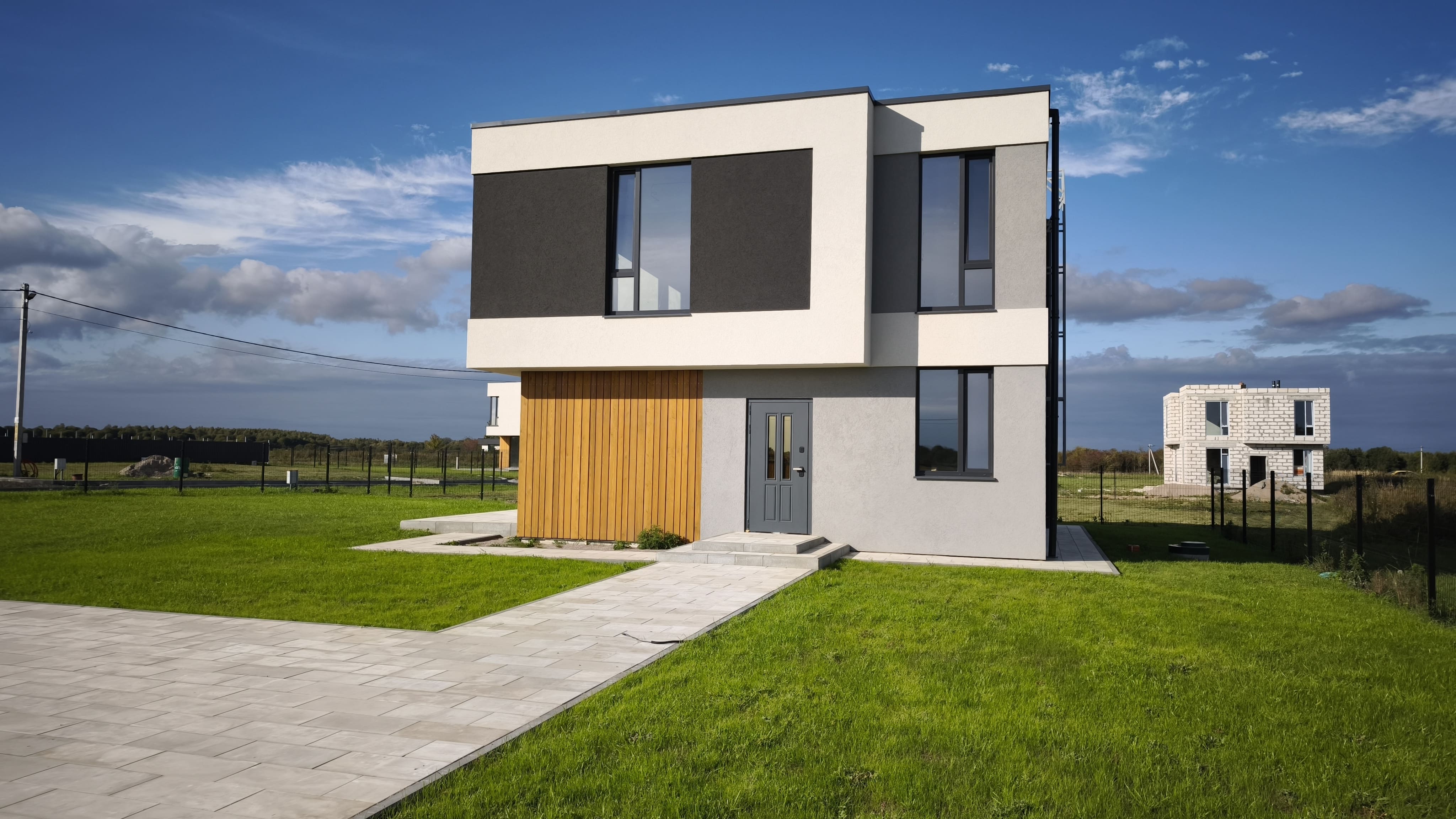 Уютный двухэтажный дом в стиле хай-тек. Панорамные окна на первом и втором этажах позволяют любоваться окружающей природой, зона для сна и отдыха расположена на втором этаже.