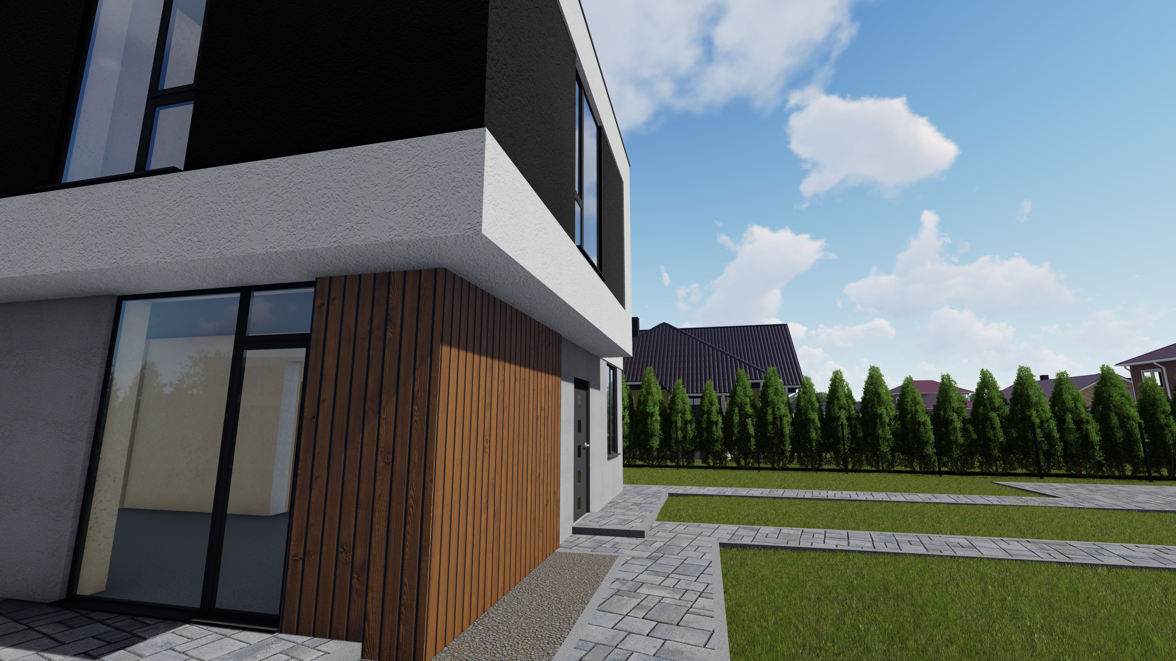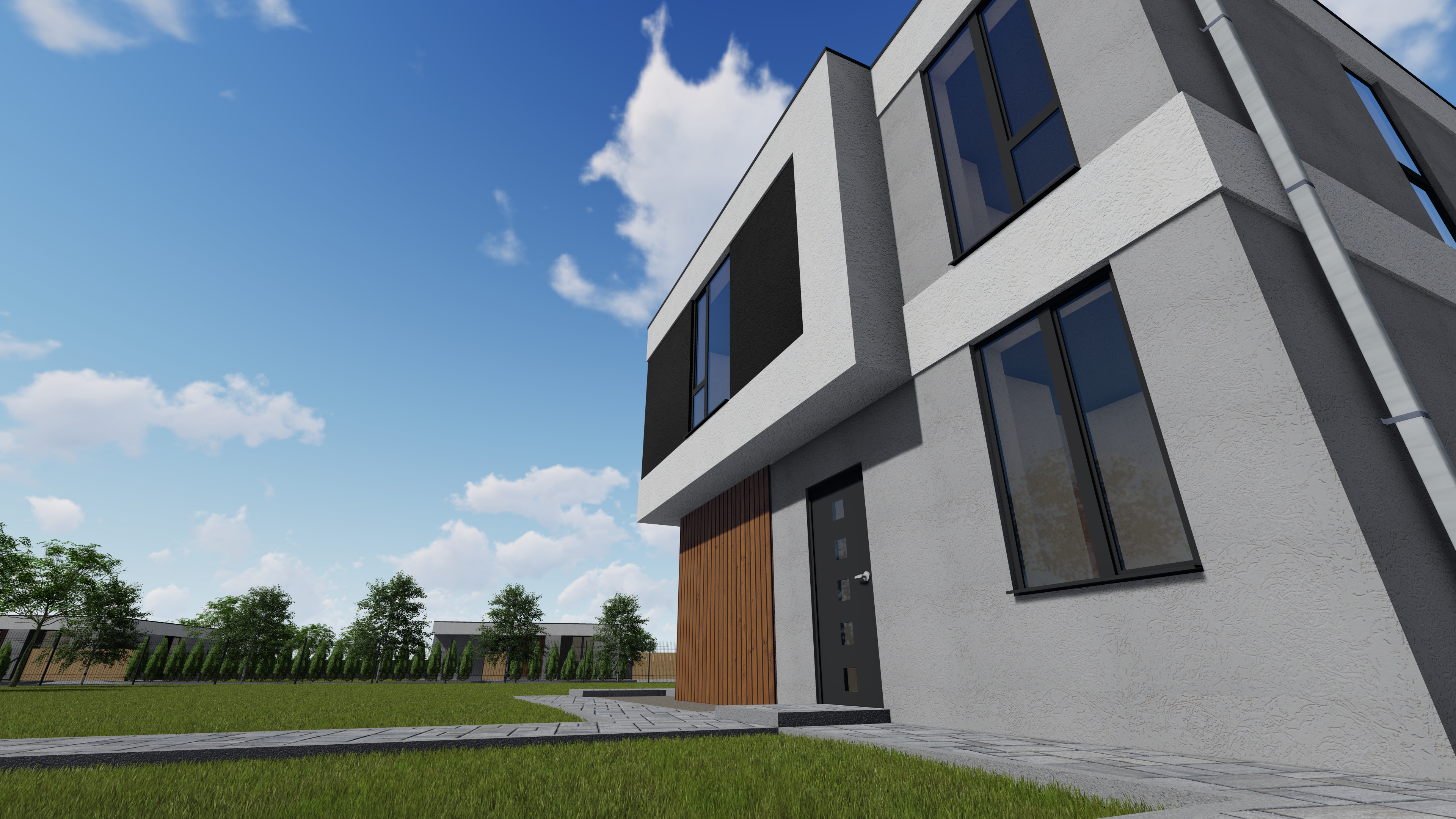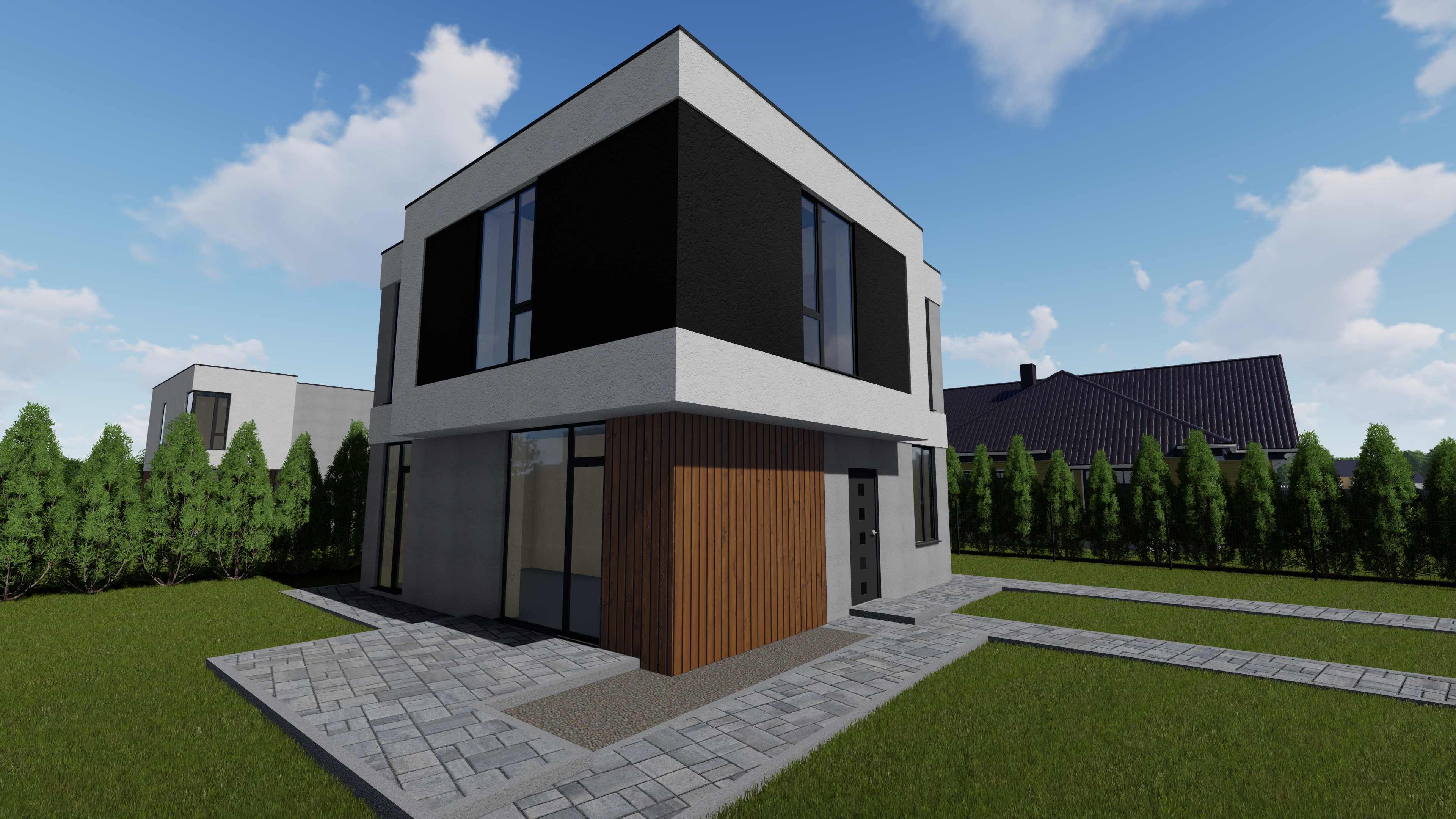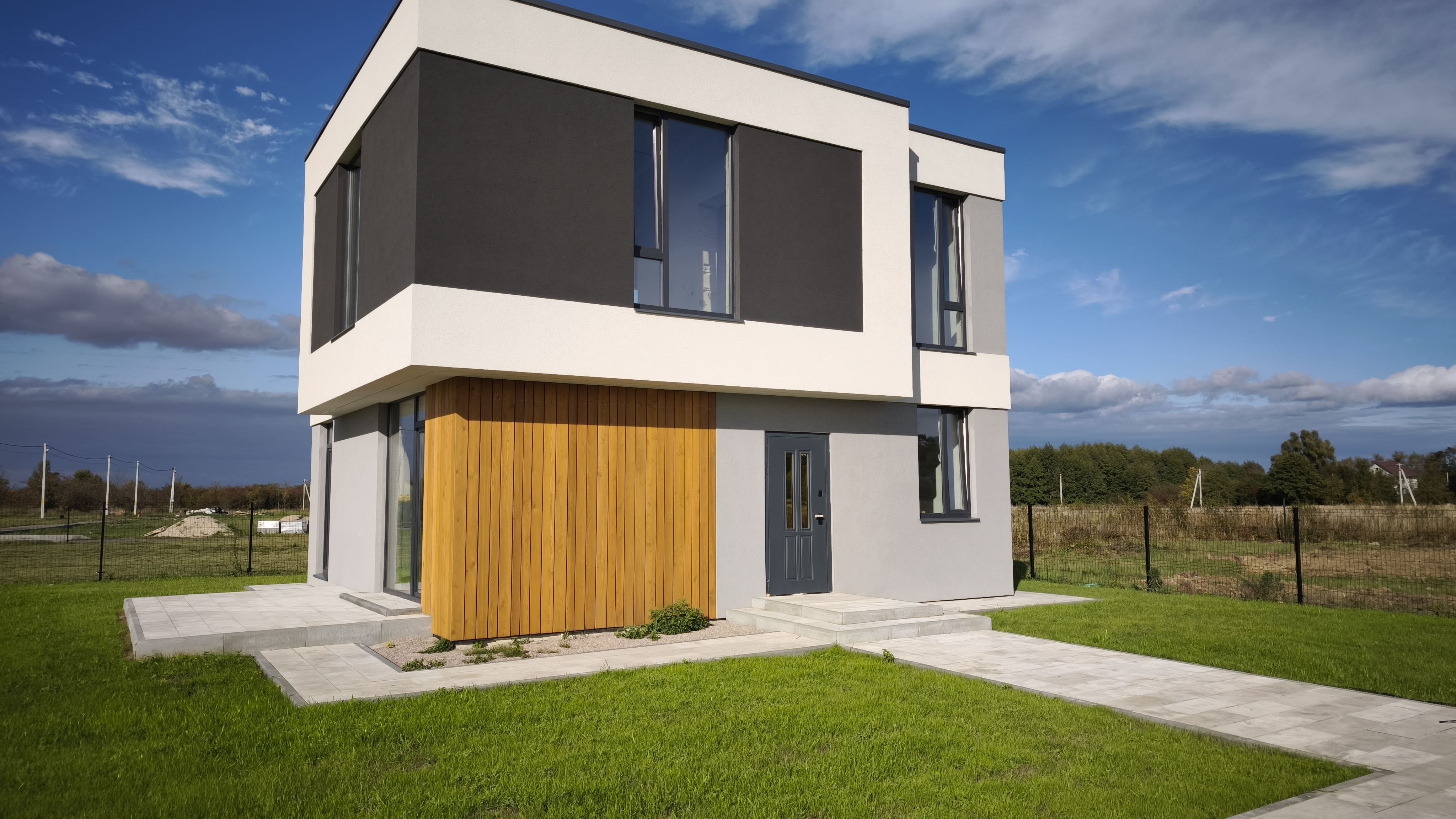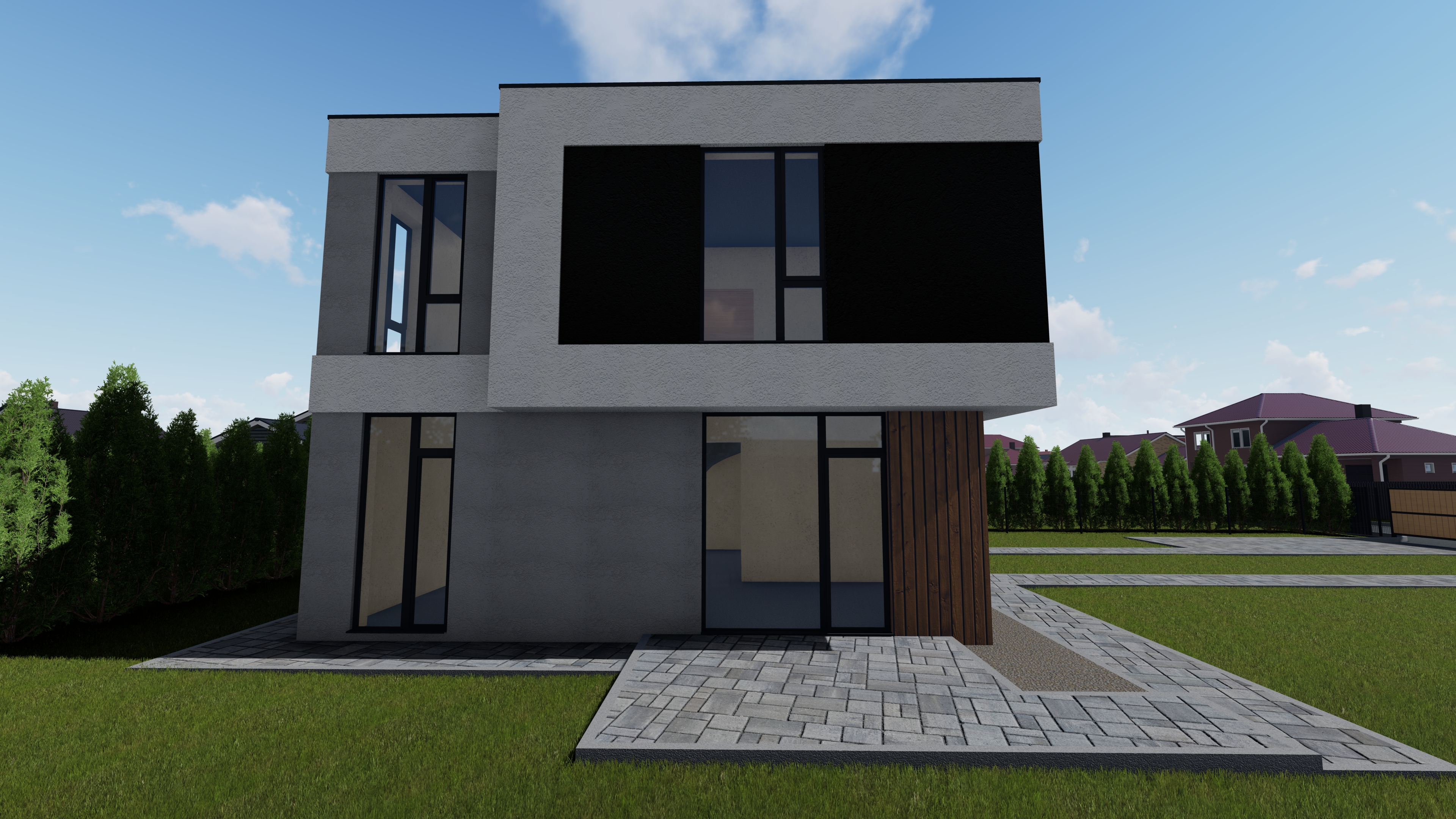 Уютный двухэтажный дом в стиле хай-тек. Панорамные окна на первом и втором этажах позволяют любоваться окружающей природой, зона для сна и отдыха расположена на втором этаже.