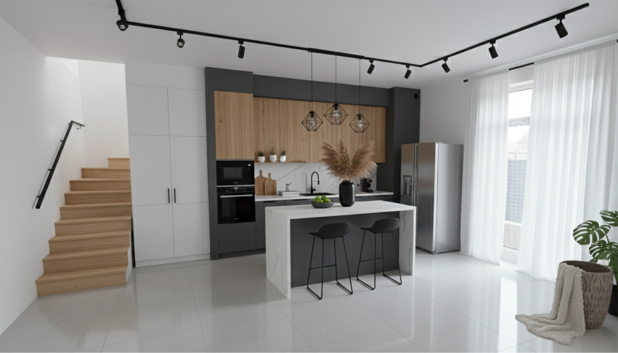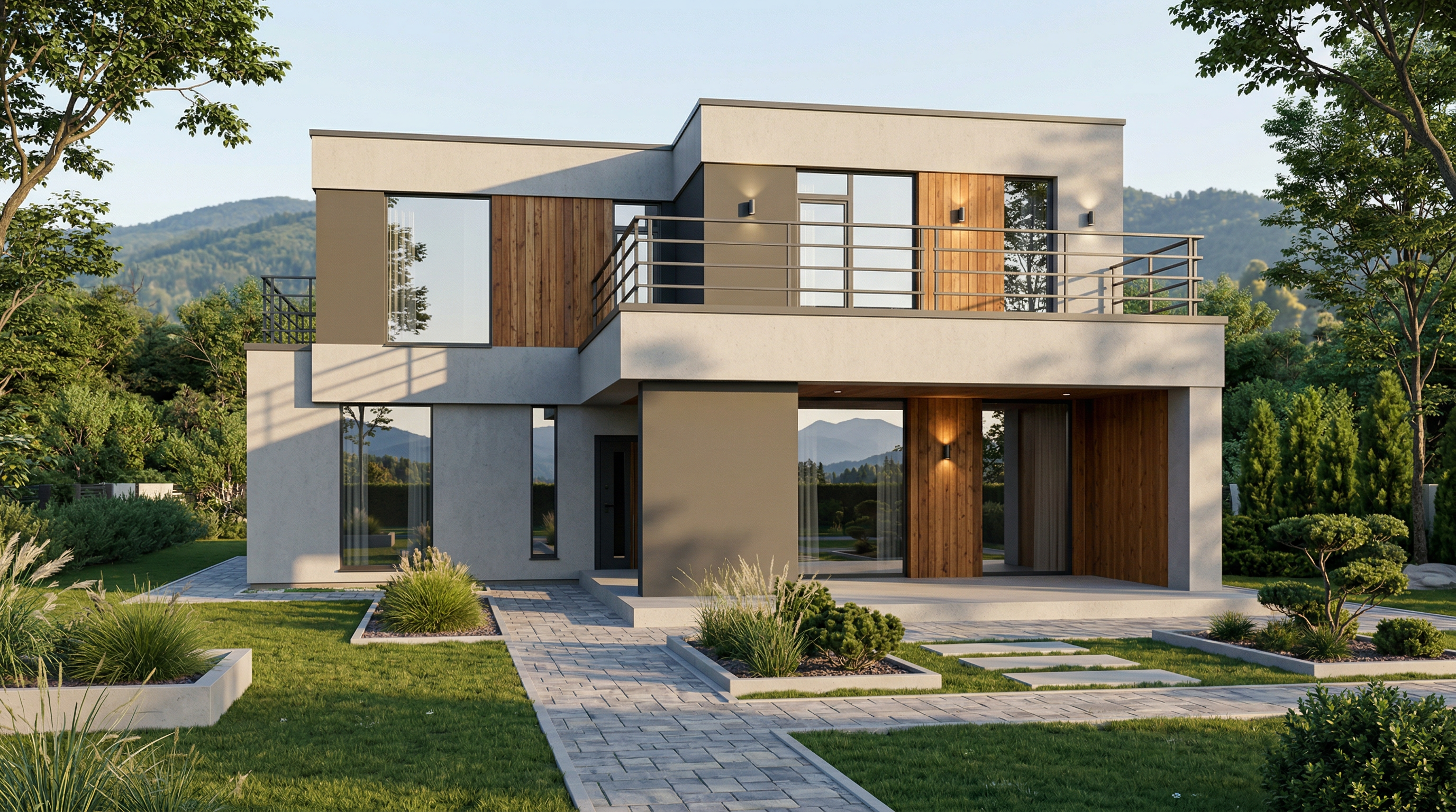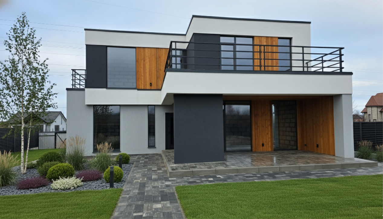 Этот проект создан для тех, кто ценит масштаб и безупречную геометрию двухэтажных домов. Архитектурное решение гармонично объединяет контрастные фасады и теплоту натурального дерева, создавая облик, который выделяется на фоне типичной загородной застройки.